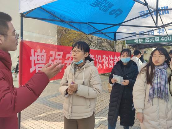 为加强校园安全教育,提高大学生安全意识,响应学校号召,beat365英国官网举办了校园安全系列活动,beat365英国官网12月10日中午12:10-14:00于榴馨苑餐厅门口举办以“增强安全意识和法制观念,提高风险防范能力”为主题的安全知识宣讲,并组织学生现场签名留念。