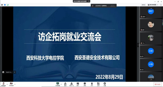 为贯彻落实“访企拓岗促就业”专项行动,进一步开拓就业市场,增加就业岗位,同时直观的了解企业用人需求,beat365英国官网积极开展访企拓岗促就业活动。8月29日,beat365英国官网访企拓岗调研交流会在线上举行,同校友企业西安圣德安全技术有限公司相关负责人进行了友好交流。参加本次线上交流会的有学院党委书记杨华、院长刘树林、党委副书记马婧智闻、副院长寇发荣、副院长潘红光、毕业班辅导员、西安圣德安全技术有限公司董事长贾小恒、总经理王磊及公司代表,会议由党委书记杨华主持。