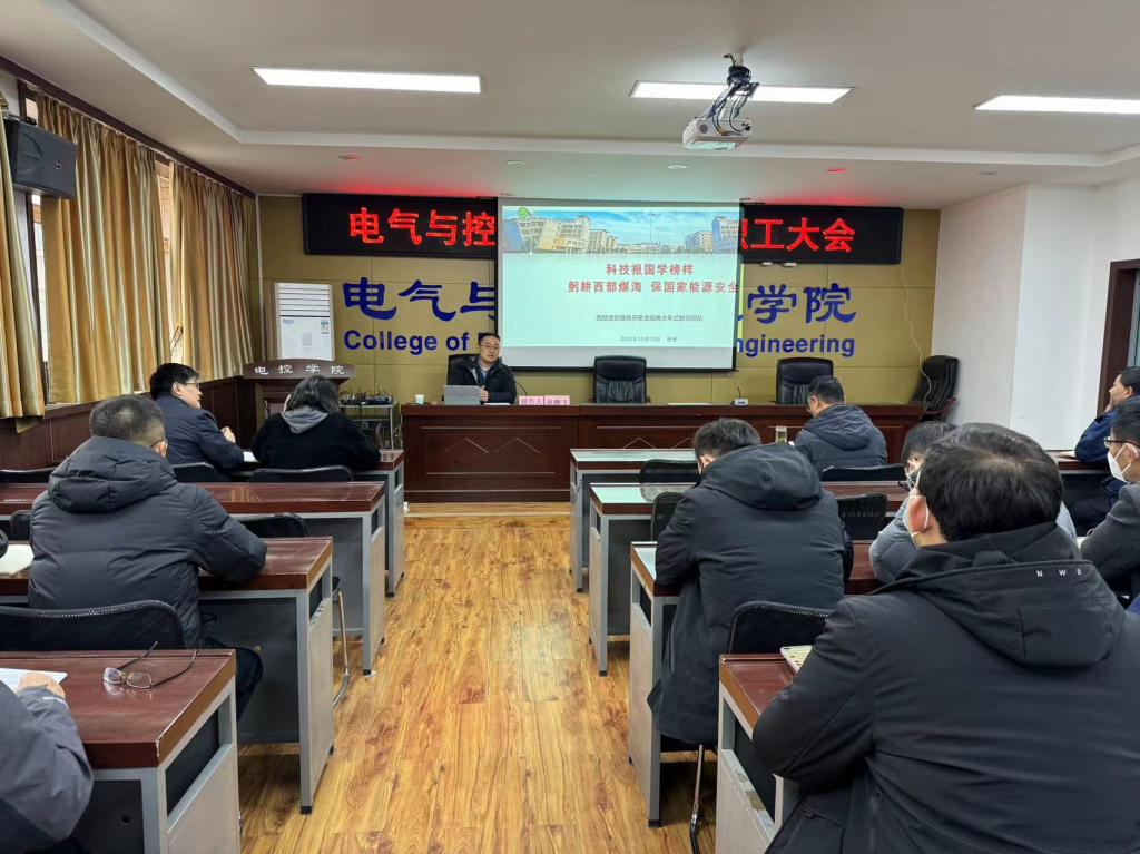 beat365官网全国黄大年式教师团队“西部煤炭绿色开采教师团队”骨干成员单鹏飞教授以“科技报国学榜样,躬耕西部煤海,保国家能源安全”为题,从团队沿革、科技创新、服务煤矿、发展方向等几个方面,给我学院师生做了一场精彩的报告。