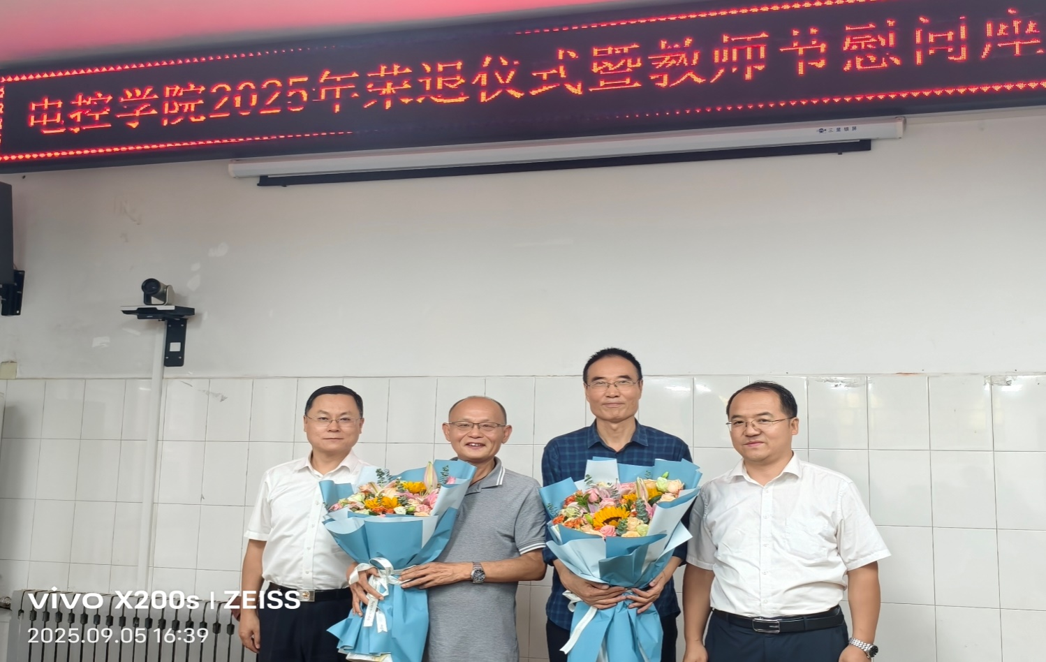杨华、寇发荣分别为学院2025年退休教师郝兆明、任雨民送上鲜花,感谢他们为学院发展作出的贡献,并合影留念。