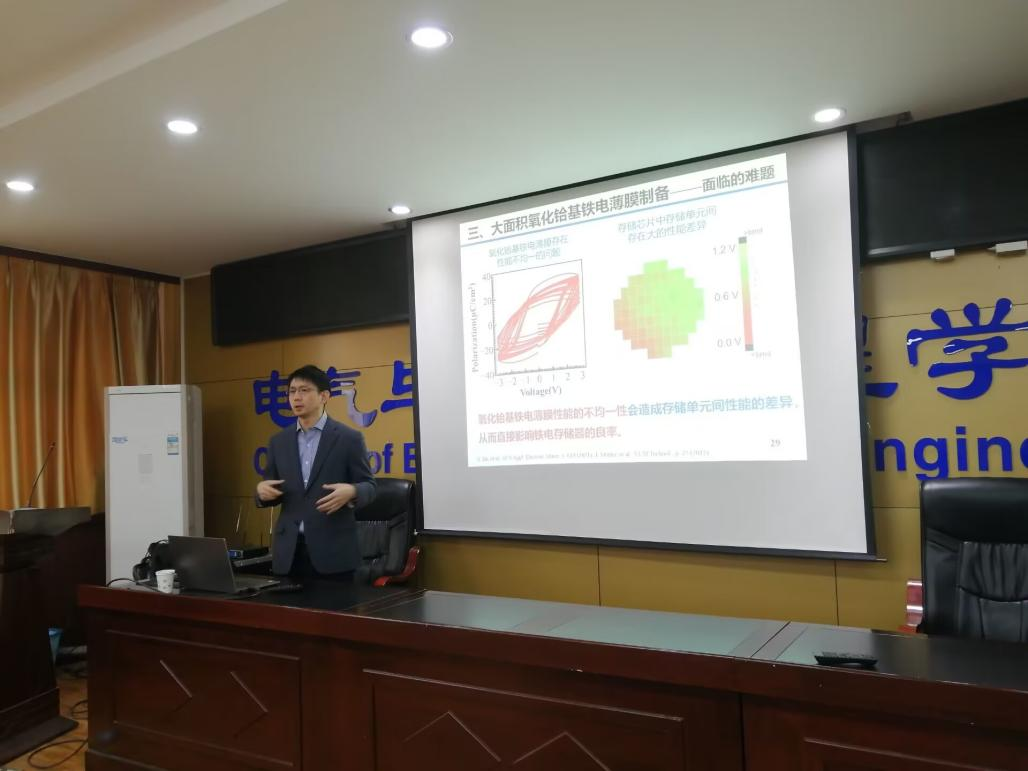 10月19日上午,西安电子科技大学廖敏教授受邀来beat365英国官网作学术交流,并作了题为《氧化铪基铁电薄膜及其存储器》的学术报告,beat365英国官网师生近100余人聆听了报告。报告会由院长寇发荣主持。